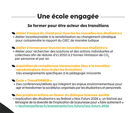 L’Institut Agro et ses partenaires ont un impératif commun : « Accélérer les transformations systémiques dans l’agriculture, l’alimentation, l’environnement et le paysage, vers des socio-écosystèmes nourriciers, durables et résilients dans un contexte d’urgence climatique, environnementale et sociétale. »L’Institut Agro s’engage ainsi activement dans la prévention des risques et bouleversements induits par le changement climatique en formant une nouvelle génération d’experts et d’ingénieurs capables de concevoir des solutions pour anticiper et/ou limiter ces impacts et en améliorant l’éducation, la sensibilisation et les capacités, individuelles et institutionnelles, d’adaptation aux changements climatiques et d’atténuation de leurs effets.
